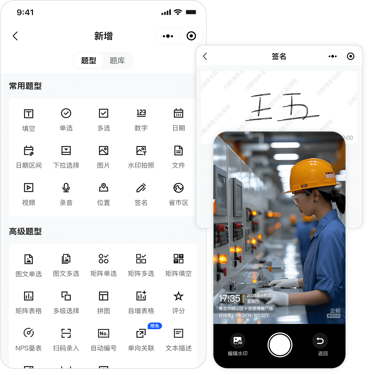 除常规题型外还提供水印拍照、签名、公式、单向关联、查找引用等高级题型
