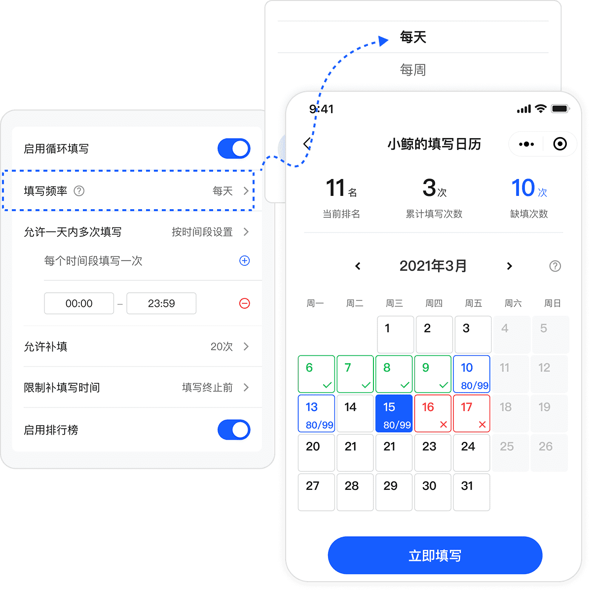 填写日历、补填规则、填写提醒、排行榜,各种配套功能齐全