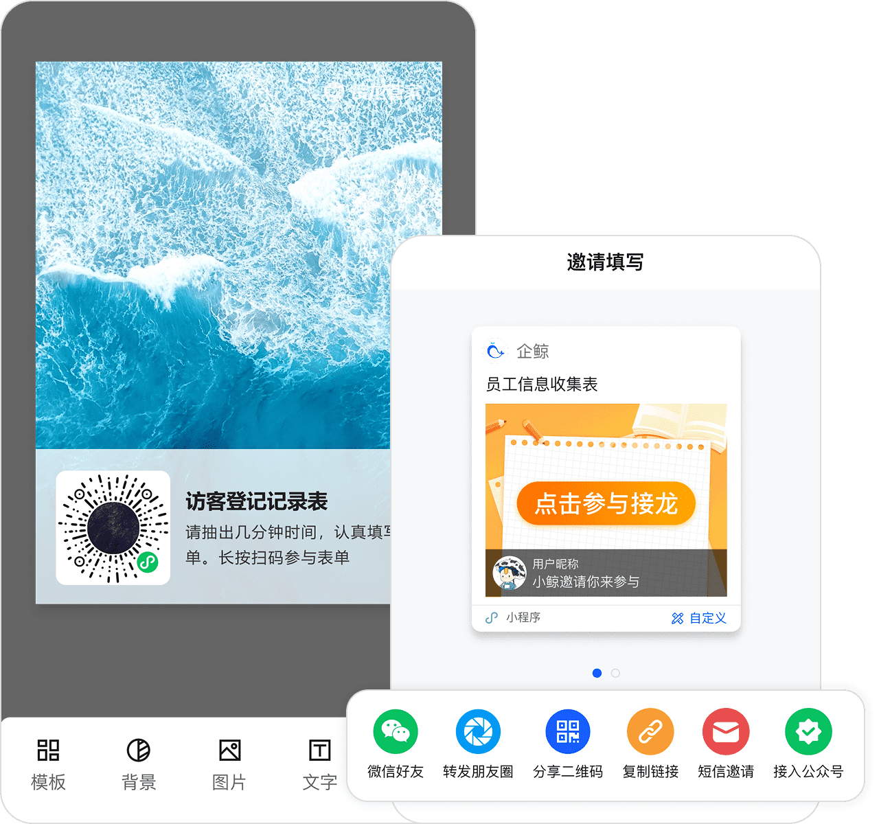 支持小程序卡片、二维码、链接、短信、接入公众号、分享朋友圈多种表单分发方式