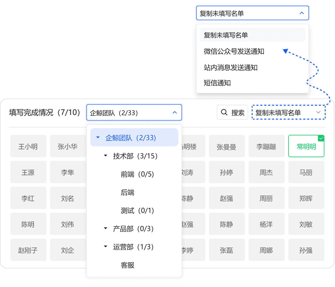 可预置名单或选择团队成员来限定填写人,填写情况颜色区分,一目了然