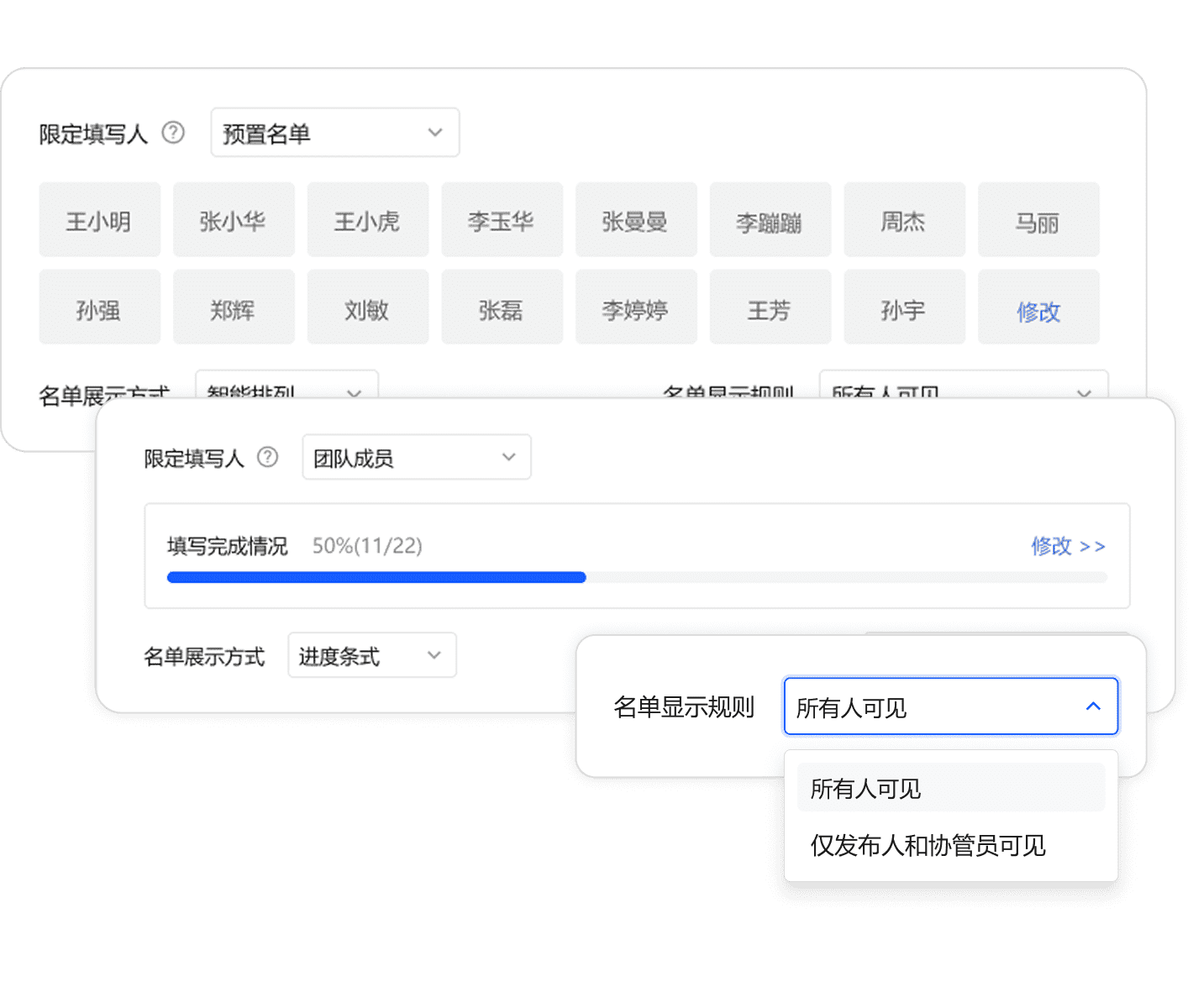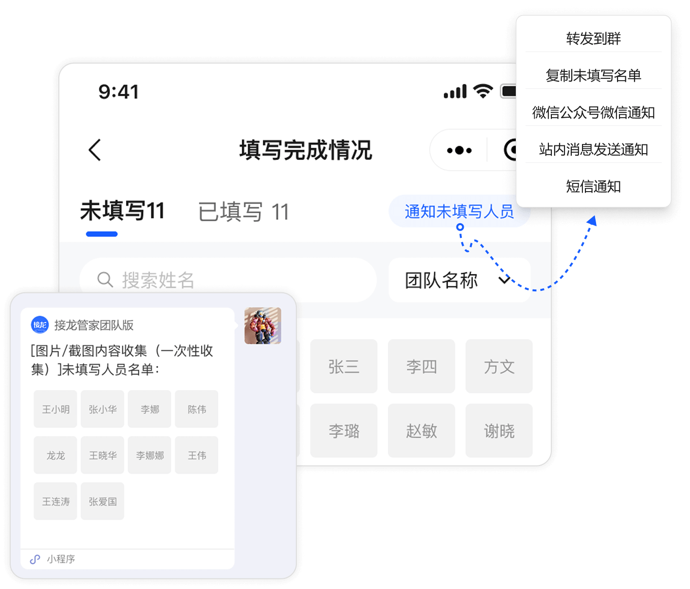 限定填写人后,可以直观查看表单填写进度,一键通知未填写人督促完成填写