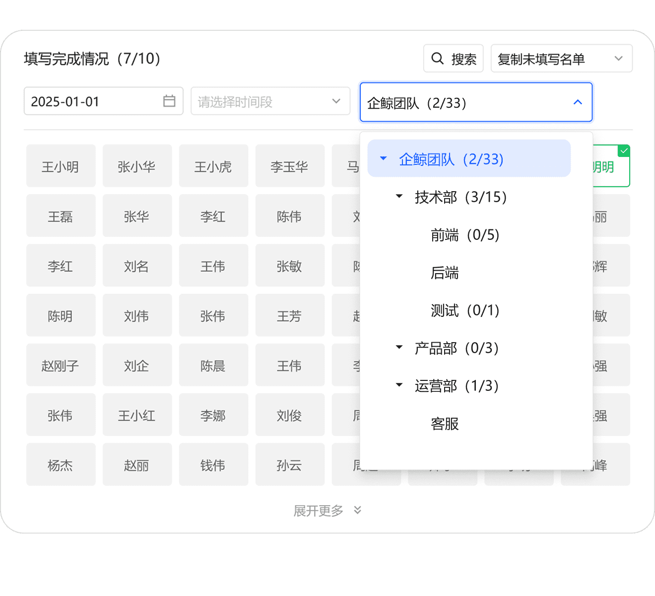 名单支持搜索,如限定团队成员自动分部门统计填写情况