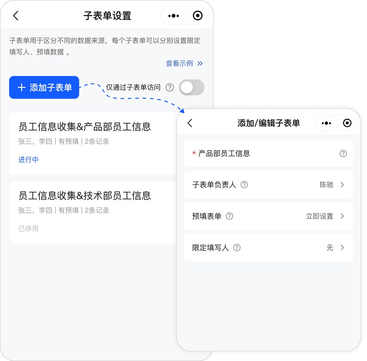 每个子表单可单独设置名称、负责人、限定填写人、预填数据