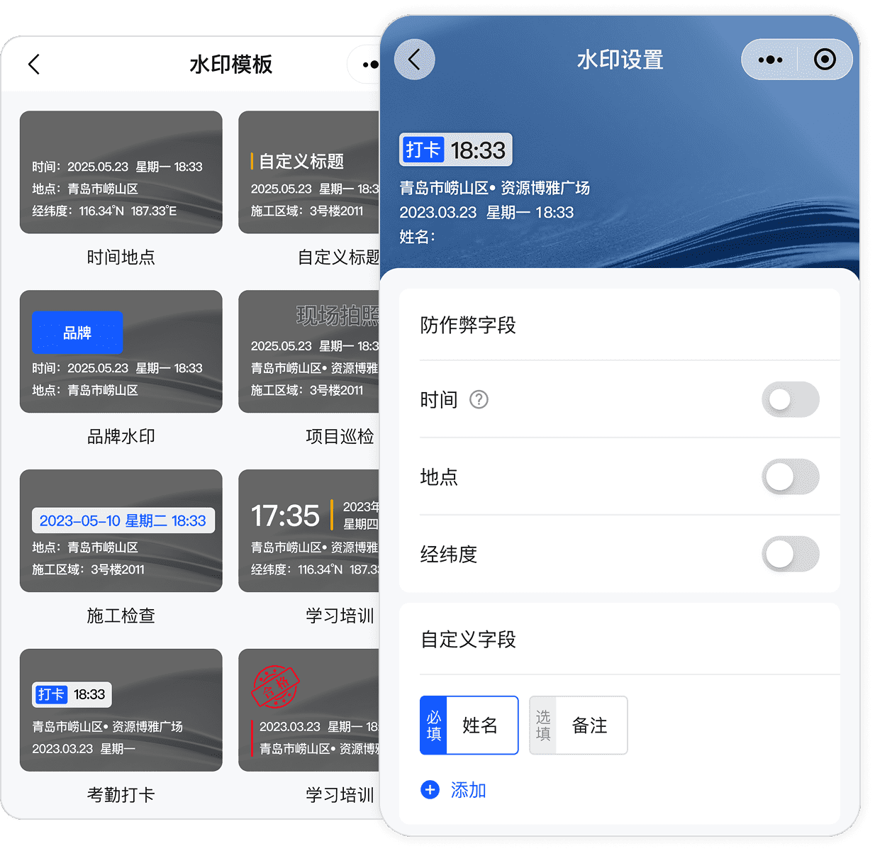 预置时间地点、项目巡检、施工检查、考勤打卡、合格/不合格、品牌水印等多个水印模板