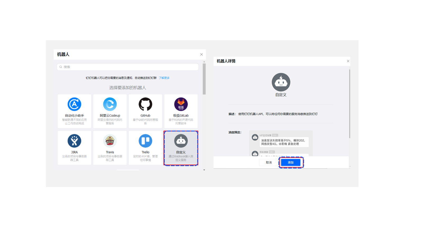 在创建机器人类型中选择“自定义”,在机器人详情点击“添加”;