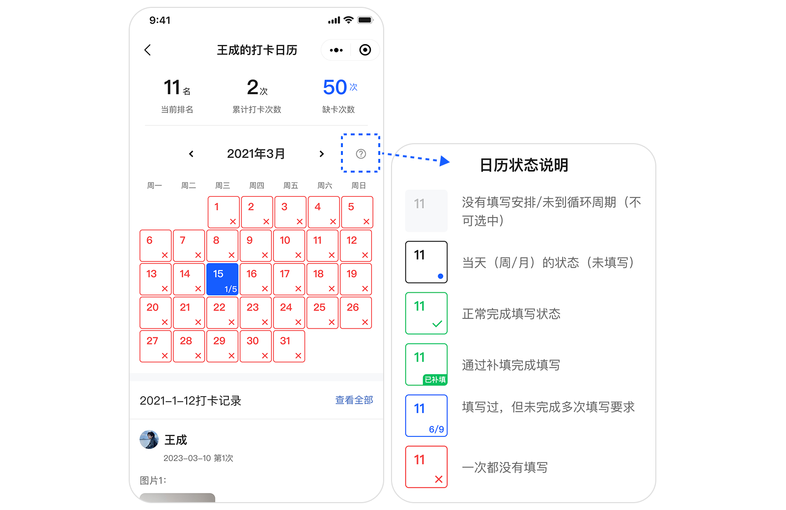 不同颜色区分完成填写、部分填写、未填写,一目了然;