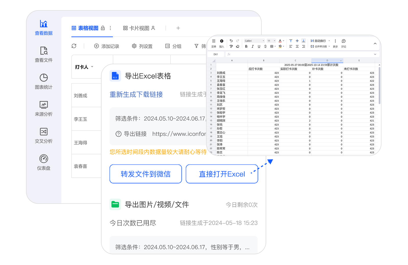 打卡数据可以直接导出Excel,方便考勤管理人员使用。