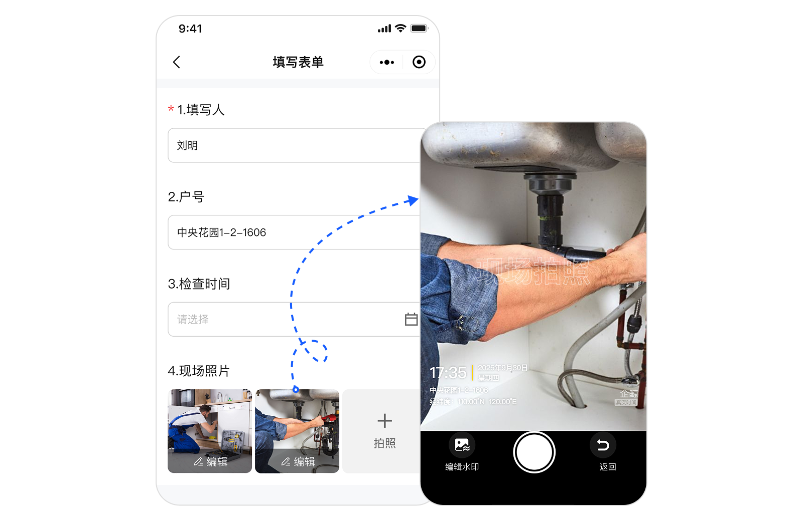 填写含有水印拍照的表单,只能现场拍照上传无法从相册选择,确保时间地点真实。