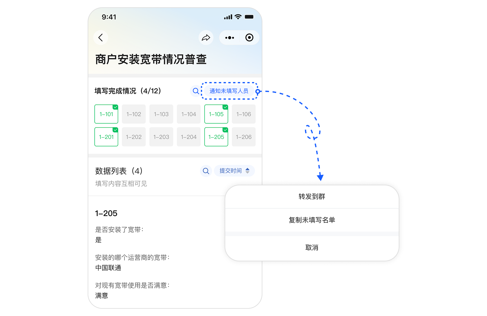 通过企鲸发布表单,实现在线收集任务完成后留痕的图片,收集后数据自动统计汇总。从此告别传统方式难统计效率低下的问题,提高相关人员的工作效率。