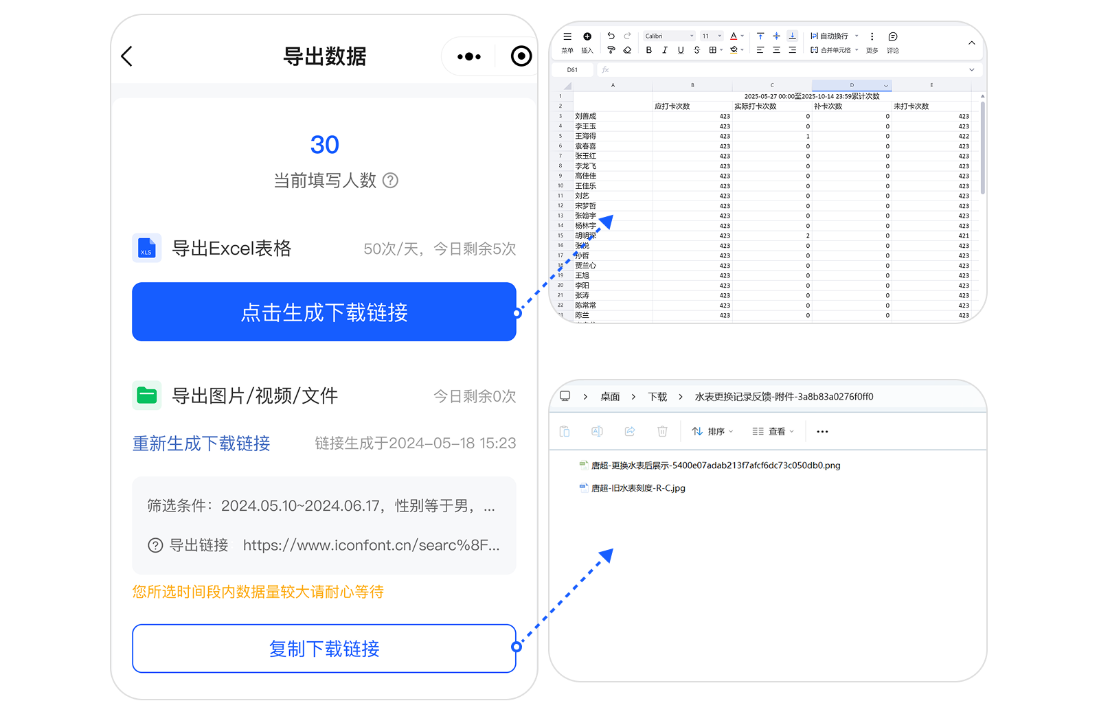 | × 拍摄完工照片后直接发送至工作群,数据量较多且图片保存时间短,导致过期后无法查看; | √ 用表单记录员工的完工情况和照片,既方便对跟踪各员工的任务完成情况,也方便随时查询或导出任务完工记录; |