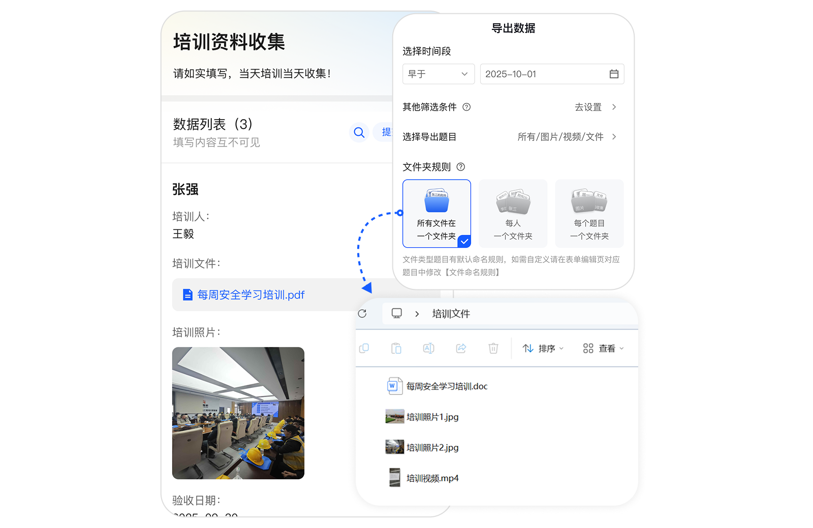 导出规则灵活,可选择导出时间段、筛选条件、需要导出的题目以及文件夹规则(可选择所有文件在一个文件夹、每人一个文件夹等)。
