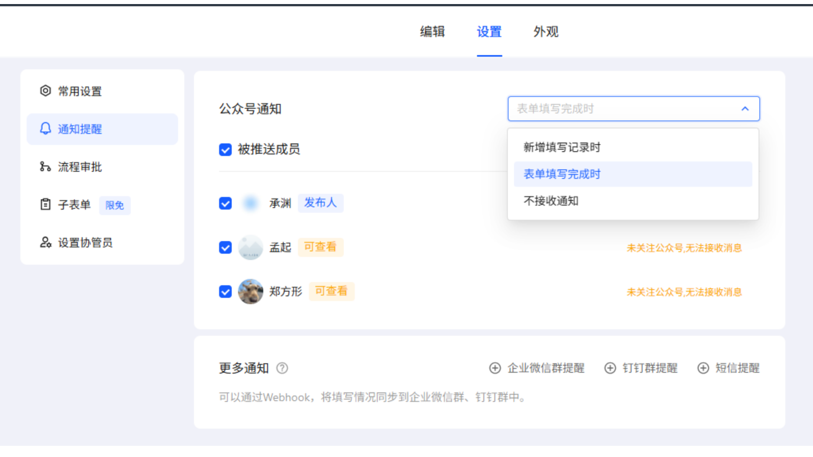 可以设置接收表单完成情况通知,除了不接收外有两种频率:新增填写记录时和表单填写完成时