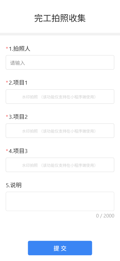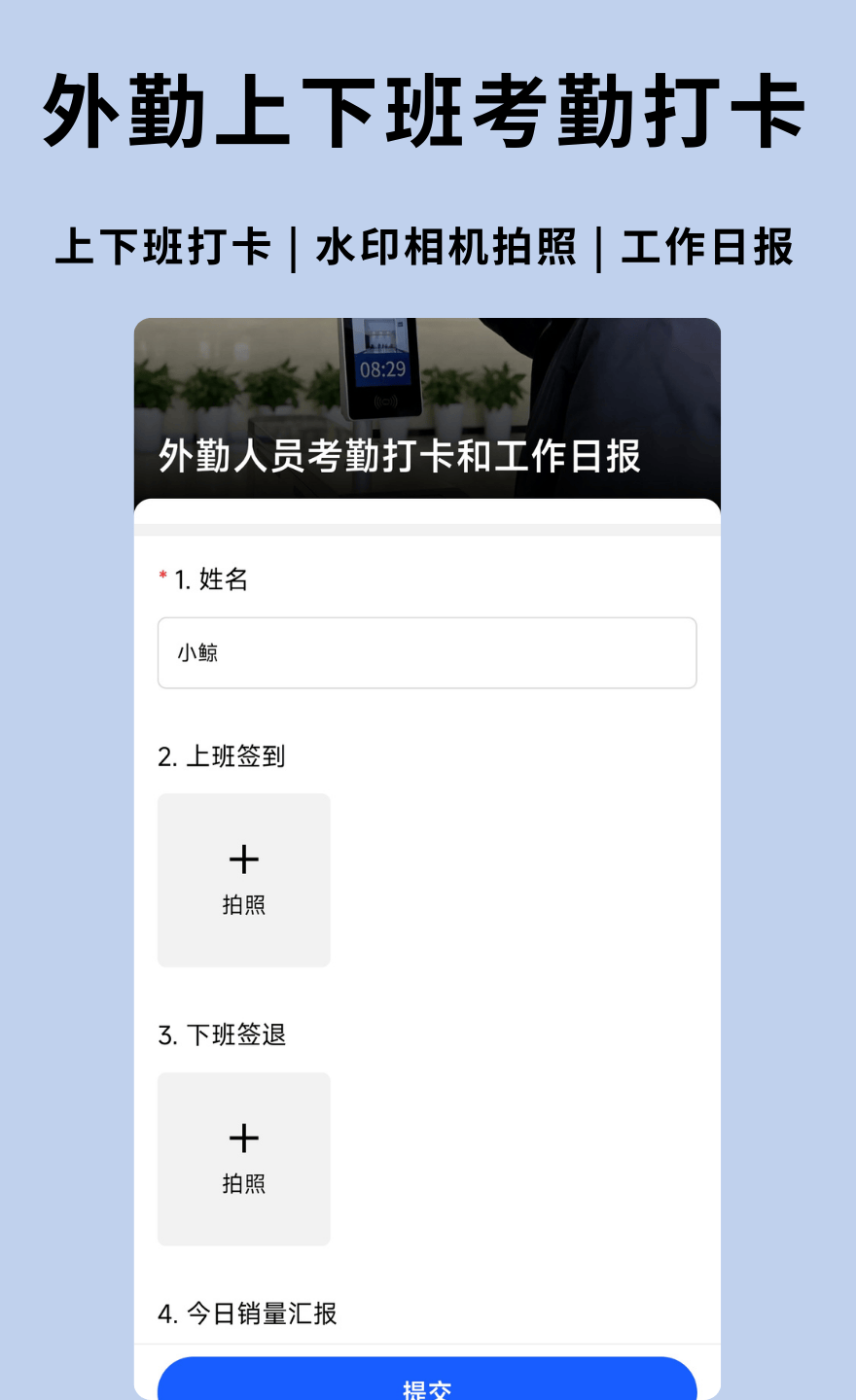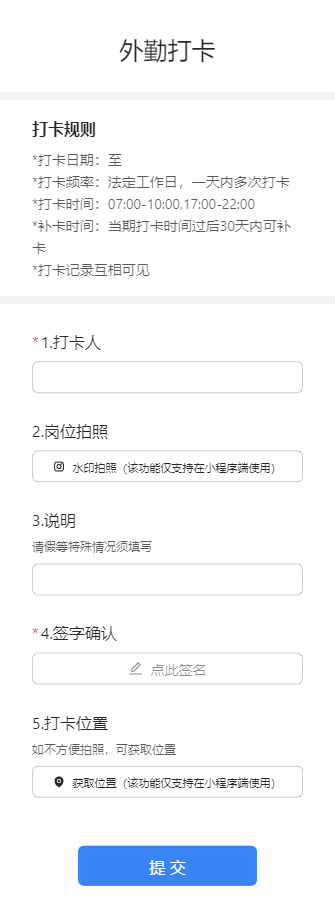 发布循环填写的表单,根据打卡需求设置一天多次打卡,打卡时要求自拍(防止代打卡)和工作场所的水印拍照(时间地点真实防篡改)
