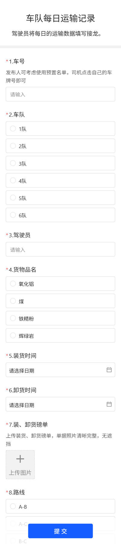 设置表单上传题目,装卸货过程、收货人凭据都可以拍照上传,使内容可以结构化存储